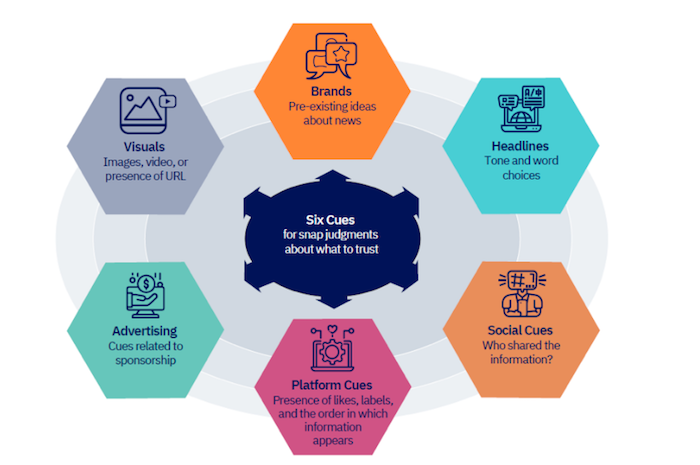 Zprávy, na které narazí při procházení sociálních sítí, zhodnotí velmi rychle. Důležitý je titulek, perex, pokud ho daná sociální síť u sdíleného článku zobrazuje, a vizuální doprovod. Na Facebooku je rozhodující počet lajků a komentářů a také to, kdo daný příspěvek sdílí. Na WhatsAppu je zásadní, kdo dané zprávy v chatovacích skupinách posílá. A ve vyhledávači Google se hodnotí pořadí ve vyhledávání, které slouží jakožto indikátor kvality – články, které se zobrazují na přední pozici, získávají větší důvěryhodnost než ty, co se řadí na pozice nižší.