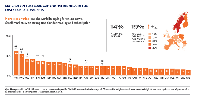 Češi navíc v porovnání s ostatními státy si stále nezvykli platit za online obsah. Nejvíce ochoty projevují skandinávské země, například v Norsku si loni zakoupilo přístup k online zpravodajství 30 % respondentů, v Česku pouze 8 %.