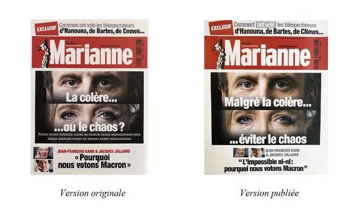 Původní verze titulní strany nesla fotografii očí dvou prezidentských kandidátů, centristy Emmanuela Macrona a nacionalistky Marine Le Penové. U prvního z nich stálo „Vztek..." (La colère...), u druhé „...nebo chaos?" (...ou le chaos?). Fotografie zůstala, ale text se změnil. Časopis vyšel ve verzi „Navzdory hněvu... ...zabránit chaosu". Zásahu doznala i citace v podvalu titulní strany.