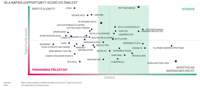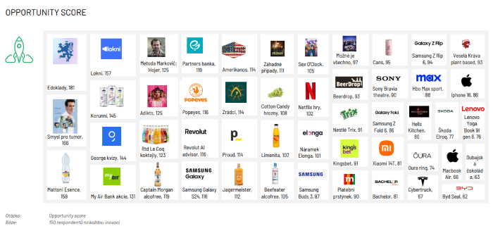 Z porovnání 50 nových produktů, které byly uvedeny na českých trh v uplynulých měsících, byla průměrná inovace relevantní pro 27 % populace, unikátní či odlišná pro 41 % a drahá vůči konkurenci pro 49 %.