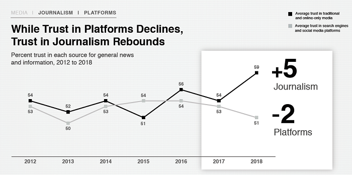 Ještě v roce 2015 přitom situace byla opačná – tradiční novinařině důvěřovalo pouze 51 procent lidí, zatímco online platformám 54 %. Důvěryhodnost novinařiny se v očích veřejnosti od té doby zvedla o celých osm procentních bodů.