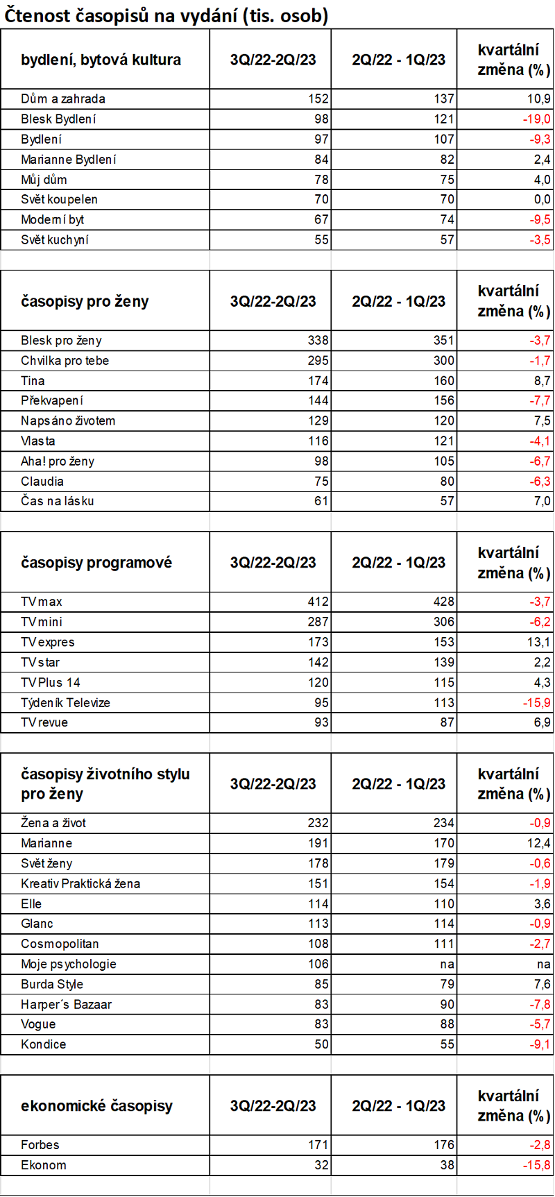 Ve srovnání s předešlým měřením si nejvíce polepšily časopisy životního stylu pro ženy a mírně svou čtenost zvýšily časopisy o bydlení a bytové kultuře. Stabilní zůstává kategorie zpravodajských týdeníků. Naopak se snížila čtenost programovým titulům, které ale zároveň zůstávají čtenářsky nejsilnější časopiseckou kategorií, a také magazínům zaměřeným na péči o zdraví.