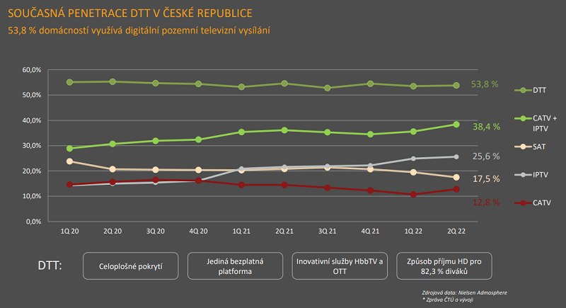 DTT vysílání je v Česku stále nejrozšířenější formou příjmu televizního signálu. Využívá ho 54 % českých domácností, přičemž penetrace DTT platformy je v čase relativně stabilní. Druhým nejsilnějším je IPTV příjem, který za poslední roky narostl na 26 %, na druhou stranu klesá podíl domácností využívajících satelitní vysílání (na 17,5 %). Ve druhém letošním čtvrtletí se zvýšil podíl kabelového vysílání na 13 % (více viz graf níže).