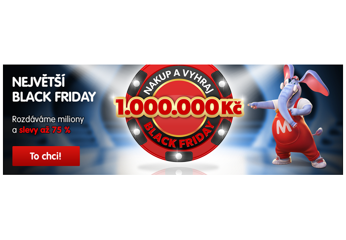 České internetové tržiště Mall.cz letos spustilo Black Friday akci s výrazným předstihem osmi týdnů. Ti, kteří od 8. října až do půlnoci z 24. na 25. listopadu nakoupí, budou zařazeni do slosování o milion korun. Výherce bude e-shop vybírat každý listopadový pátek. V Česku rozdá celkem 4 mil. korun. Slevová akce vyvrcholí 28. listopadu.