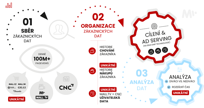 Sběr dat o návštěvnících webu je již docela standardizovanou disciplínou. I my pracujeme se sběrem dat na základě cookies. Data jsou tedy plně anonymizovaná a neobsahují osobní údaje jako je jméno či adresa. Jednoduše řečeno, máme na stránkách Mall.TV nasazený vlastní měřící kód a ten sleduje, kde se pohybuje daný anonymní uživatel. Sbíráme data nejen na Mall.TV, ale stejnou technologii máme nasazenou a sbíráme tak data z největší skupiny e-shopů v České republice. Stejné pixely pak sbírají anonymní data i na webech vydavatelství CNC. Spojení takových dat je pak jednoduché. Když je uživatel pixelem označený, a nejprve si čte nějaké zprávy, pak zabrousí na infotaiment Mall.TV a pak si něco koupí na CZC, jeho cestu pro nás pixel zaznamená. Vlastně podobně funguje měřící pixel, který mohou marketéři znát například z toho, jak Facebook používá své cílení reklamy. Naše výhoda je, že máme měření nasazené nejen na obsahových, ale právě i e-commerce webech. Tím jen neodhadujeme, zda daného člověka zboží zaujalo, ale dokážeme říct, zda doopravdy člověk nakoupil, nebo zda nechal zboží jen v košíku. Zároveň umíme propojit data o přihlášených uživatelích na jednotlivých platformách, a i mezi nimi data propojit.