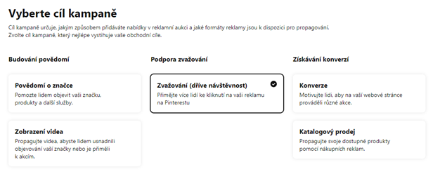 Než se do nastavení reklamní kampaně pustíte, čeká vás úvaha nad samotným účelem celé kampaně. Podobně jako u dalších sociálních platforem můžete reklamou budovat povědomí o vaší značce, podporovat zákaznické zvažování třeba v podobě návštěvnosti vašeho webu nebo získat konverze.