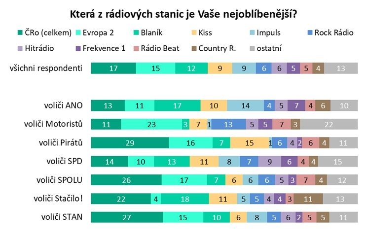Nejoblíbenější rozhlasovou stanicí je Český rozhlas, silný především u voličů vládní koalice a Pirátů. Voliči ANO a SPD naopak preferují Blaník a Impuls, Motoristé často poslouchají Evropu 2, Rock Rádio a Rádio Beat.