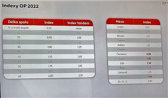 Sezónní indexy se zvyšují pro červenec až září a rovněž pro první část prosince (1.-24.12.). Zvyšuje se také příplatek za super break (vysílaný ve 20:15) o 20 %.