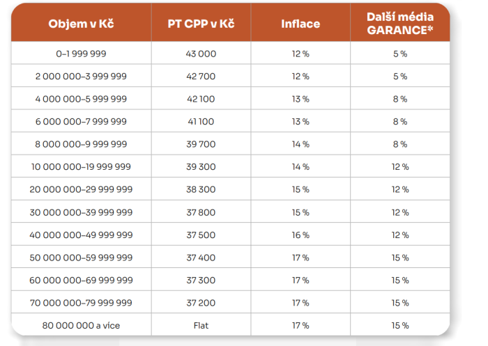 Nová bude povinnost klientů s rozpočtem nad 10 mil. Kč upřesnit rozložení GRPs kampaní v rámci kalendářního roku a také povinnost investic do dalších médií (OMK, tj. sponzoring, product placement, online bez eGRP, HbbTV aj.) podle rozpočtu klienta. Aby klienti dosáhli na příslušnou cenu CPP (viz tab. níže), musí garantovat určitý objem investic do OMK.