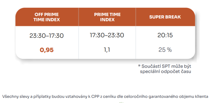Klientům, kteří uzavřou závazek na rok 2024 do 1.12. 2023, bude aplikován off prime-time index na úrovni 0,90 a prime-time index na úrovni 1,05. Pro uzavřené závazky do 12.1. 2024 bude aplikován prime-time index na úrovni 1,05 a off prime-time index 0,95.