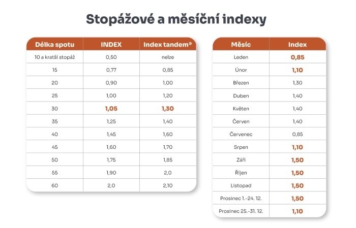Navýšení CPP se pohybuje v rozmezí 12-17 % a je opět nejvýraznější u vyšších klientských objemů. Zvyšují se i stopážové a sezónní koeficienty – u 30vteřinových spotů se index zvyšuje na 1,05. Media Club tak chce podpořit, aby klienti využívali kratší spoty. Navyšují se sezónní koeficienty především ve druhé části roku. Vyšší je i off prime-time koeficient.
