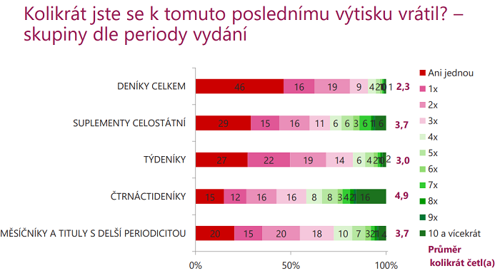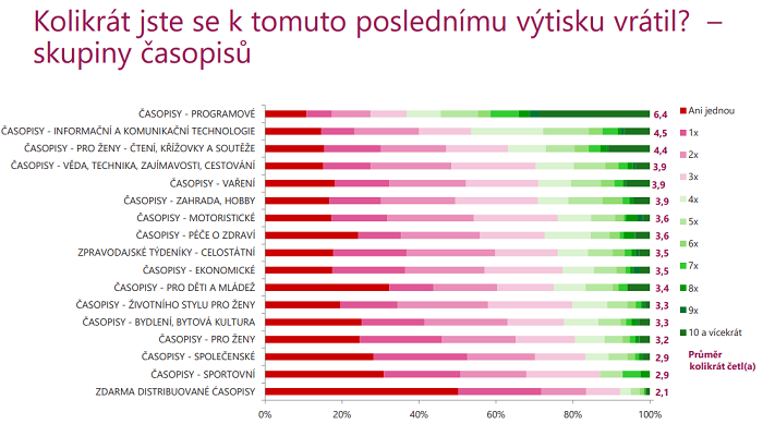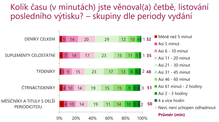 Ze srovnání vyplývá, že nejdelší strávený čas je se čtrnáctideníky a měsíčníky. V jejich případě tráví někteří čtenáři četbou (včetně opakovaného čtení) i více než čtyři hodiny. Konkrétně pak nejvíce času tráví čtenáři s tituly informačních a komunikačních technologií (ICT), s časopisy o vědě, technice, zajímavostech a cestování a se zpravodajskými týdeníky. Průměrná doba je v uvedených případech vyšší než hodina.
