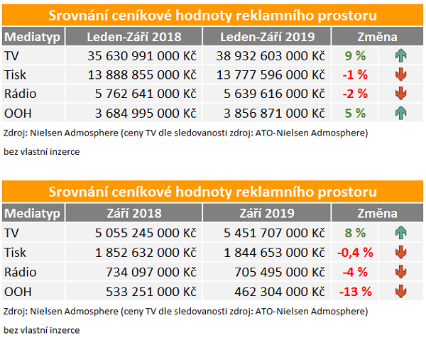Monitorované investice do nákupu reklamního prostoru v médiích za tři letošní čtvrtletí jsou podle monitoringu AdIntel od Nielsen Admosphere v průměru o 5 % vyšší než ve stejném loňském období. Růst reklamních investic táhne především televizní reklama a částečně také venkovní reklama.