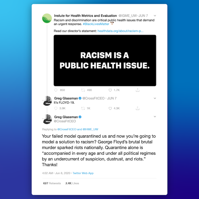 Kombinace dvou nevhodných vyjádření CEO značky; jednoho sarkastického tweetu k situaci okolo Floyda (obzvlášť v citlivém sociálně kulturním prostředí Ameriky) a uveřejnění interní mailové komunikace; fungovala jako katalyzátor pro odchod řady posiloven z franšízového programu (původní intenci odejít projevilo kolem 1000 ze zhruba 15000 licencovaných posiloven). Nad to se zvedla i vlna nesouhlasu od profesionálních atletů, fanoušků a trenérů. Zbrklé jednání, nevhodné načasování, nepochopení situace. Výsledkem byl nejen odchod majitele Grega Glassmana a odkoupení značky, ale také distancování se sportovců od hlavních závodů sportu, takzvaných CrossFit Games, spolu s poškozením jména firmy a potenciálně reálnými (zatím nevyčíslenými) ztrátami z licencí, které si posilovny neprodlouží.