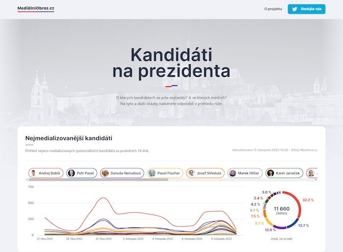 Jak jsou na tom mediálně aktuální kandidáti na prezidenta, ukazuje nový projekt Mediální obraz, který přináší přehled mediální stopy jednotlivých prezidentských kandidátů a poskytuje otevřená data pro jakoukoli instituci nebo širokou veřejnost. Za projektem stojí společnost Monitora Media.