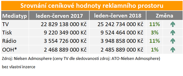 Investice do reklamního prostoru v médiích v prvním pololetí 2018 se ve srovnání se stejnou částí minulého roku zvýšily o 9 %. Dlouhodobý trend tak i nadále zůstává růstový. Největší zásluhu na tom má televize a rozhlas, oba mediatypy vykazují 11% nárůst. Mírně nad úrovní loňského roku mají být i tištěná média a outdoor. Vyplývá to z monitoringu reklamy Ad Intel výzkumné agentury Nielsen Admosphere.