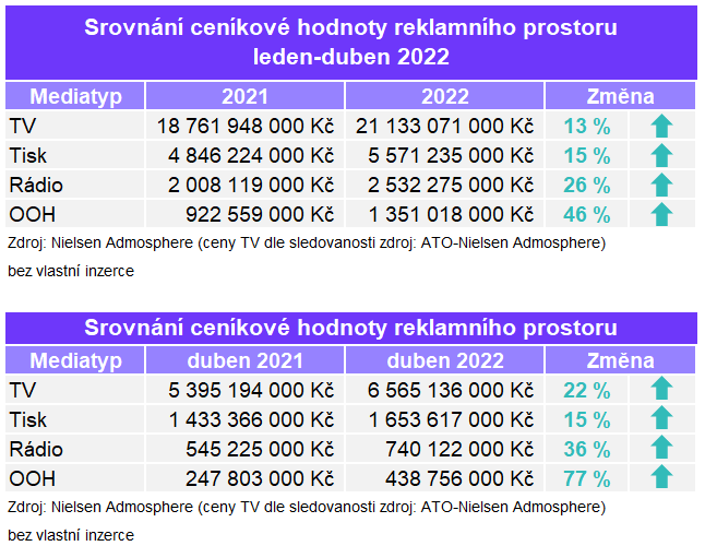 Data monitoringu za první čtyři měsíce roku 2022 tak ani nenaznačují zpomalení nebo pokles investic v souvislosti s válkou na Ukrajině, na což upozorňovali někteří zástupci mediálních provozovatelů.
