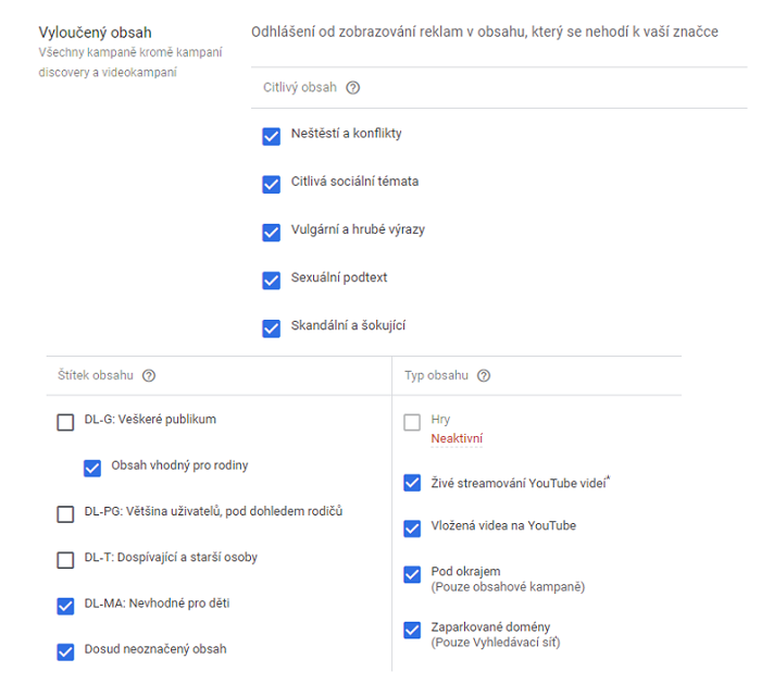 Jen velmi málo firem se chce zobrazovat u obsahu, v němž se nachází citlivá tematika, neštěstí, vulgární výrazy nebo sexuální podtext, doporučujeme proto podobná témata zcela vyloučit. Zároveň zvažte, jestli byste neměli také vyloučit umístění na nežádoucích webech (např. těch dětských).
