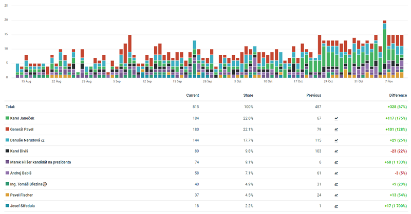 Dvacet jedna. Fibonacciho číslo, atomové číslo skandia nebo taky počet kandidátů v prezidentských volbách v lednu 2023. Tedy zatím, ale spíše jich bude nakonec méně. A ačkoliv je možná pro budoucnost České republiky zásadnější výsledek nedávných (a nejspíš posledních) prezidentských voleb v Číně, zaměříme se v tomto textu opět na blížící se prezidentské volby české. Na konci září jsme porovnávali komunikaci prezidentských kandidátů na Facebooku, teď se podíváme na další oblíbenou sociální platformu v Česku – Instagram. A zaměříme se na komunikaci oficiálních kandidátů tak, jak je uvádí ke dni 13. listopadu web E15.cz. Zároveň s vědomím toho, že sledována byla aktivita prezidentských kandidátů na Instagramu za posledních 90 dnů (13. 8. - 10. 11. 2022) z hlediska obsahu i inzertní aktivity.