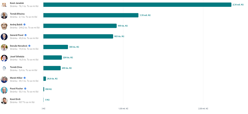 Podle knihovny reklam Meta za posledních 90 dnů nejvíce reklam realizovali Petr Pavel (389) a Karel Janeček (273), následuje Danuše Nerudová (144) a Andrej Babiš (105). Neplatí ale přímá úměra mezi počtem reklam a vyčerpaným rozpočtem. Protože je jen na vás jako na inzerentovi, kolik peněz které reklamě „dopřejete”.