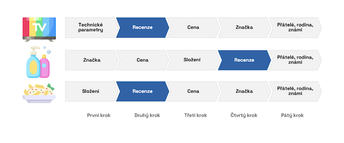 S typem zboží se preference Čechů mění. Při nákupu televize se zákazníci nejprve podívají na technické parametry a poté se zajímají o uživatelské recenze. Během nákupu hotového jídla zajímá Čechy složení a poté recenze. Například u šamponů vybírají čeští zákazníci nejprve značku, poté řeší cenu, složení a až následně recenze a počet hvězdiček.