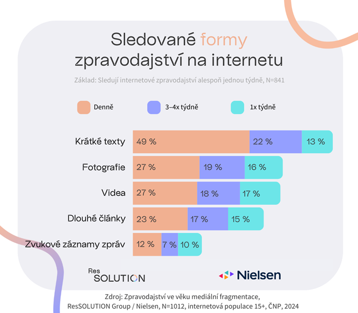 Z forem online zpravodajství sledují uživatelé, kteří alespoň týdně konzumují zpravodajství online, hlavně krátké texty. Na děleném druhém místě jsou v současnosti (v případě minimálně týdenní konzumace) vizuální formy, a to fotografie a videa. Dlouhé články se zařadily až na čtvrté místo a zvukové záznamy zpravodajství na páté.