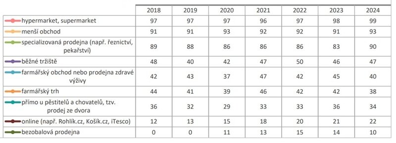 Z časového srovnání od roku 2018, vyplývá, že se od té doby návštěvnost hypermarketů a supermarketů, stejně jako menších a specializovaných obchodů nezměnila. Platí to i pro tržiště a rovněž i pro farmářské obchody nebo prodejny zdravé výživy. Zde se zájem o ně zvedl mezi lety 2018- 2021, od roku 2021 ale mírně klesá na původní hodnoty. Od roku 2021 se také mírně snižuje návštěvnost farmářských trhů. Nejviditelnější změny se týkají nakupování online, které se nejvíce zvýšilo mezi lety 2018 až 2021 a za posledních sedm let se pak téměř zdvojnásobilo.