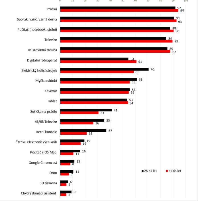Pravda bude asi někde uprostřed, vzhledem k tomu, že to, co dělá největší rozdíly mezi oběma skupinami Čechů jsou chytré televize, pračky a na druhé straně robotické vysavače nebo osvětlení. Čili ne nějaké extra speciální přístroje.