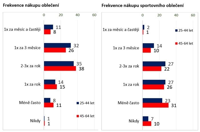 Jak vidíte na uvedených příkladech dat, v nákupech oblečení Češi ve věku 45-64 let zas tak moc nezaostávají za těmi mladšími. O něco vyšší frekvence nákupů běžného oblečení u Čechů ve věku 25-44 let je hodně ovlivněna zaopatřováním dětí a o malinko vyšší tendencí sledovat módní trendy. U sportovního oblečení je to u generace 45+ kromě faktoru dětí také přece jen nižší frekvence cvičení a skutečně sportovních aktivit. Na druhou stranu vhledem k početní síle této skupiny Čechů, jde i tak o zajímavé objemy zboží.