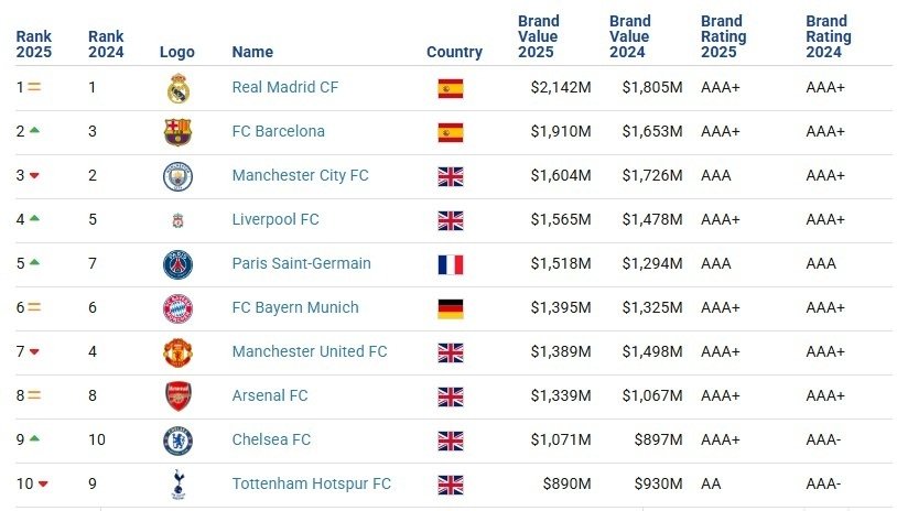 Hodnota značek elitních fotbalových klubů roste, a to i přes rozdílné sportovní výsledky. Podle nejnovější studie Brand Finance se na prvních dvou místech globálního žebříčku umístily španělské kluby Real Madrid a FC Barcelona. Oba posílily nejen své finanční ukazatele, ale i pozici mezi globálními sportovními a spotřebitelskými značkami.