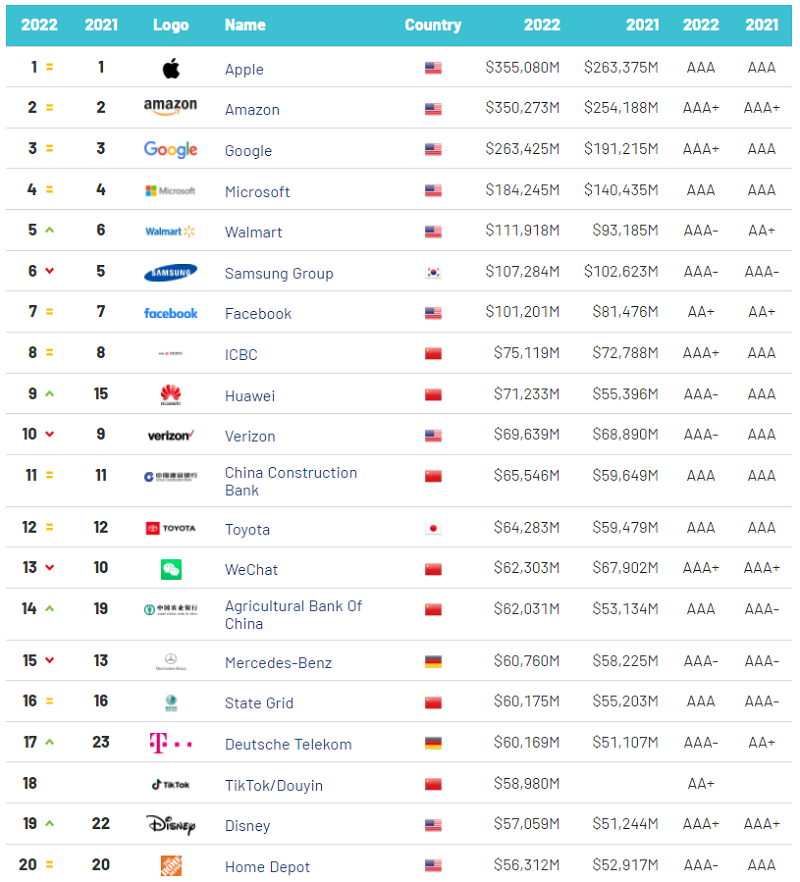 Společnost Apple drží podle nového žebříčku BrandFinance titul nejcennější světové značky s hodnotou více než 355 miliard USD. Na druhé příčce následuje Amazon a třetí nejhodnotnější značkou je Google. Vedoucí trojice se ve srovnání s loňským žebříčkem nemění. Čtvrtý v pořadí zůstává Microsoft, na páté místo se posunul Walmart. Všechny uvedené značky mají domovské sídlo v USA.