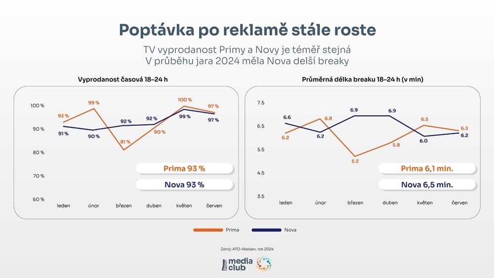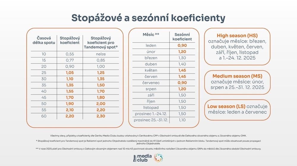Obchodní zastupitelství Media Club zvýší pro rok 2025 ceny televizní reklamy v průměru o 18 až 22 %. Navýšení zohledňuje jak růst základní ceny CPP, tak také růst některých sezónních i stopážových koeficientů. Portfolio zastupovaných stanic Media Clubu se ale pro příští rok nemění: vedle stanic skupiny Prima, které se rozšíří o dva nové kanály, má nadále prodávat reklamu i pro skupiny TV Óčko, TV Barrandov, Atmedia i Paramount Network. Stejná zůstává také primární nákupní cílová skupina 18–69 let. Sekundárně pak mohou klienti využívat také 24 definovaných cílových skupin.