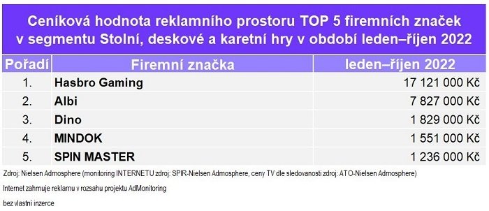 V inzerci stolních, deskových a karetních her letos vede značka Hasbro Gaming, pod niž spadají hry jako Monopoly, Twister nebo Cluedo. Mezi lednem a říjnem tohoto roku umístila inzerci v ceníkové hodnotě přes 17 milionů korun. Albi mělo ve stejném období reklamu v hodnotě necelých 8 milionů korun a Dino necelé 2 miliony korun. Mezi produktovými značkami jsou největšími inzerenty letošního roku zatím Cluedo (Hasbro), Jenga Maker (Hasbro) a Science Objevuj svět! Mláďata (Albi). Vyplývá to z monitoringu AdIntel společnosti Nielsen Admosphere.