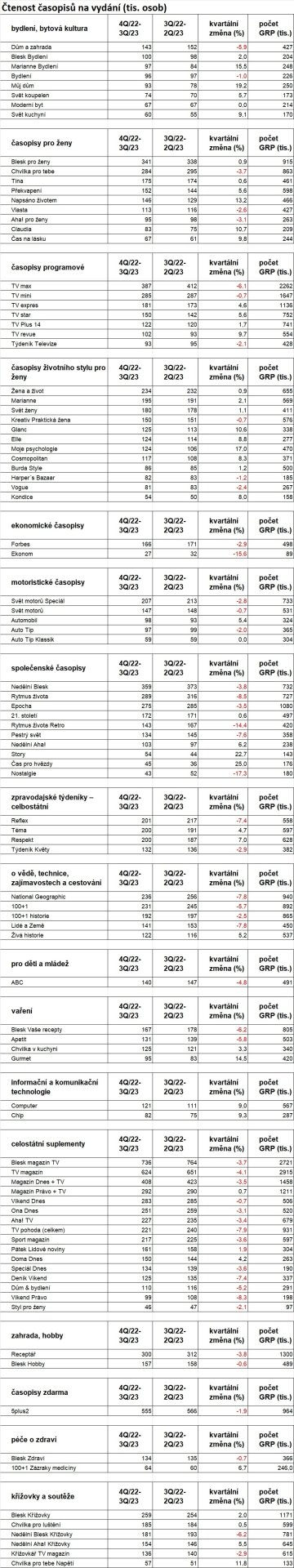 Novinkou je uvedení údajů o GRP titulů sledovaných ve výzkumu Media projekt. Ukazatel vychází z počtu čtenářů na vydání a zohledňuje také počet jejich kontaktů s jednotlivými vydáními čtených titulů a některé kvalitativní parametry tohoto kontaktu. Z dat vyplývá, že nejvyšší počet GRP generují celostátní suplementy a programové TV časopisy.