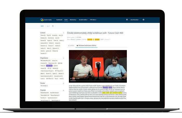 „Naši klienti chápou, že podcasty jsou příležitost pro marketing a komunikaci značky. Vyšli jsme jim vstříc a zařadili nejsledovanější podcasty a YouTube kanály do našich služeb,“ říká Petr Herian, majitel Newton Media. V mediálním monitoringu a archivu Newtonu jsou dostupná jak videa, tak i jejich automatické přepisy. „V přepsaném textu jsou zvýrazněna sledovaná klíčová slova. Po kliknutí do textové části nebo na časovou osu se zobrazuje požadovaná pasáž videa či zvukové nahrávky s přesností na jednotlivá slova. Takto přesná a uživatelsky přívětivá funkcionalita je na našem trhu unikátní. Nemusíte poslouchat celý hodinový podcast, ale jenom příslušnou pasáž, kde se mluví o vašem produktu nebo firmě,“ doplňuje Herian.