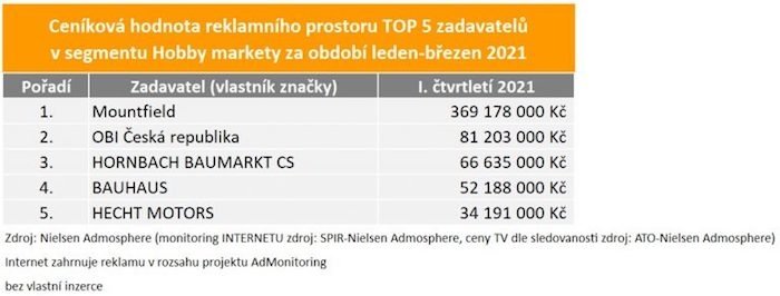 Největším reklamním zadavatelem byl za první letošní čtvrtletí zatím Mountfield, jenž podle monitoringu Ad Intel umístil v mediálním prostoru reklamu v celkové ceníkové hodnotě přes 369 milionů korun. Řetězec Obi Česká republika měl ve stejném období inzerci v hodnotě více než 81 milionů korun a Hornbach inzeroval na ploše v hodnotě necelých 67 milionů korun v ceníkových cenách.