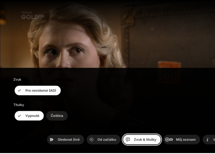 Po otevření nabídky „Zvuk a titulky“ na vybraném kanálu Nova Action, Nova Gold nebo Nova Lady se zobrazí nová předvolba pro zvuk. V sekci Zvuk je k dispozici položka Pro nevidomé (AD), která aktivuje audiopopis scény v reálném čase. Audiopopis (označovaný jako „AD“ — Audio Description) slouží k detailnímu slovnímu popisu vizuálně důležitých informací a děje. Oneplay má tyto programy umístěny na konci seznamu TV kanálů.