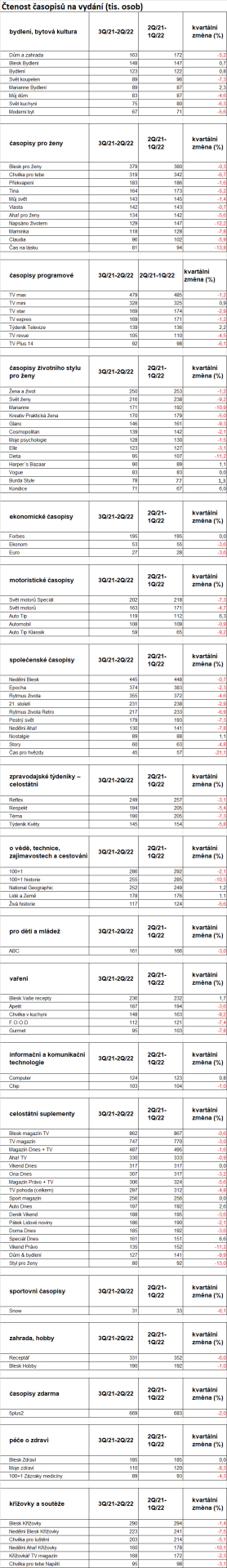 Souhrnná čtenost časopisů ve druhém letošním čtvrtletí a za období tří předcházejících čtvrtletí dosahovala celkem 6,6 mil. lidí v české populaci ve věku 12-79 let (75 %), což bylo o 1,5 % méně než v předešlém měřením období. Data výzkumu čtenosti Media projekt tak ukazují na stabilní vývoj čtenosti tuzemských magazínů. Konkrétně se vztahují k období od 1.7. 2021 do 30.6. 2022. Čtenářsky nejsilnějšími kategoriemi zůstávají časopisy společenské, časopisy s TV programem a časopisy pro ženy.