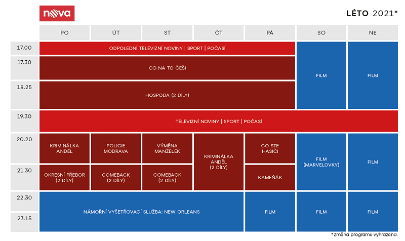 Hlavní kanál televizní skupiny Nova staví své letošní letní programové schéma na osvědčených reprízách původních seriálů televize. V pondělí a ve čtvrtek bude vysílat v hlavním čase seriál Kriminálka Anděl, v úterý Policii Modrava, středeční večery patří Výměně manželek. Ve večerním čase od 21:30 přinese zase reprízy pořadů Comeback a Okresní přebor.