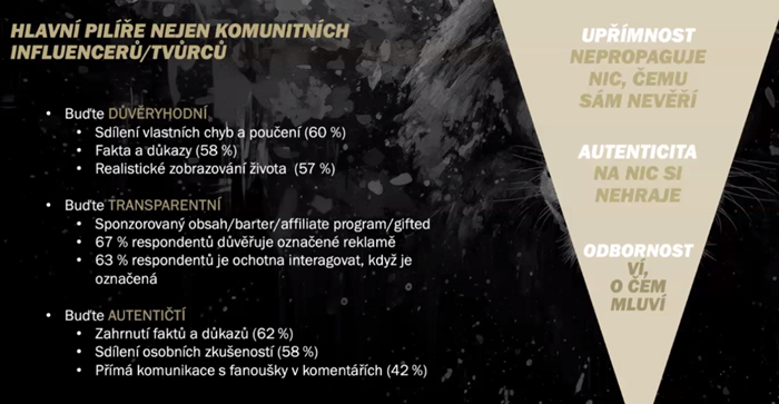 „Influenceři neskončí, ale je na nás, jak rozdělit budget a zda ho víc věnovat creatorům nebo influencerům. Ať už se rozhodnete jakkoli, nezapomínejte, že lidskost a autenticita jsou stále to, co AI zatím nahradit neumí,“ uzavřela Veronika Procházková.