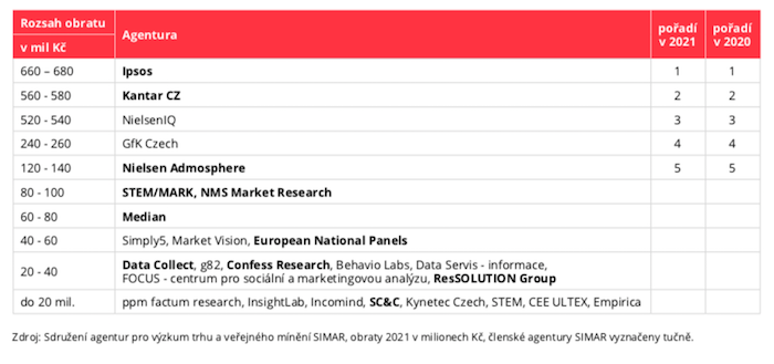Žebříček výzkumných agentur podle obratu zůstává nezměněn, první pětici tvoří Ipsos, Kantar CZ, NielsenIQ, GfK Czech a Nielsen Admosphere, jež vygenerovaly přibližně 60 % obratu českého trhu.
