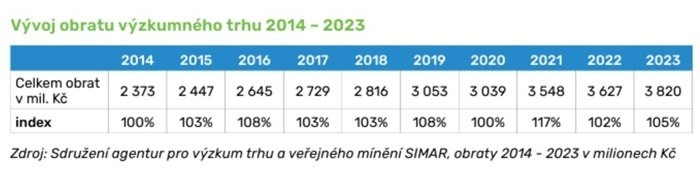 Trh výzkumných agentur udržel v roce 2023 růst, jeho obrat se navýšil o 5,3 %. Velikost výzkumného trhu v Česku v loňském roce odhaduje sdružení SIMAR na 3,820 miliard Kč. Uvádí to ve své výroční zprávě. Nedávný průzkum mezi řediteli agentur navíc odhalil optimistický výhled, přičemž 53 % z nich očekává další růst i v letošním roce.