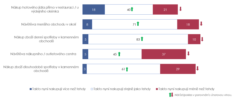 Z hlediska celkového nákupního chování (offline i online) stále platí, že více se kupují čistící a dezinfekční prostředky, jídla z výdejních okének, volně prodejné doplňky stravy a také čerstvé potraviny. Lidé rovněž víc nakupují zboží od českých výrobců a víc si hlídají to, za co utrácejí peníze. Vylepšování epidemické situace a rozvolňování opatření na přelomu jara a léto se odrazilo v návratu lidí do kamenných prodejen. Z dat vyplývá, že nakupování v kamenných obchodech se vrací do stavu podobného období před vypuknutím pandemie. 66 % lidí do průzkumu uvedlo, že kamenné obchody po rozvolnění navštěvují podobně jako před covidem. Platí to pro všechny typy kamenných obchodů. Stále ale existuje asi třetina zákazníků, kteří zboží dlouhodobé spotřeby v kamenných prodejnách nakupují méně než před covidem.