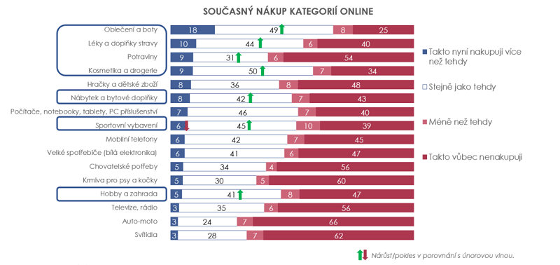 Počet lidí, kteří v Česku nakupují online, se zvyšuje i po znovuotevření kamenných prodejen. Podle šesté vlny výzkumu Jak se Češi změnili v době koronakrize od výzkumného oddělení OMG Research, nakupovalo letos v červnu online víc než dřív 50 % lidí. U žen je nárůst online nákupů vyšší než u mužů. Na druhou stranu u 40 % lidí nevedla pandemie covid-19 k vyššímu množství jejich uskutečněných online nákupů. Tito lidé nakupují online stejně jako nakupovali dříve. Covid nejčastěji neměl vliv na množství online nákupů u nejstarší věkové skupiny a u jednočlenných domácností.