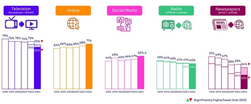 Přes online zdroje získávají informace především mladší lidi ve věku 16 -24 let, používá je až 88 % z nich. Naopak generace starší 55 let více inklinuje k tradičním zdrojům. Televizi jako hlavní zdroj zpravodajství uvádí 85 % populace 55+.