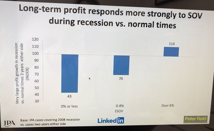 Na třech skupinách značek, které v krizi v letech 2008/2009 volily tři různé investiční strategie (velmi malé investice: SOV pod úrovní SOM, střední úroveň investic: SOV byl roven SOM, případně byl mírně vyšší a investující značky, snažící se využít příležitosti), ukázal, že značky investující v recesi zaznamenaly pětkrát větší byznysové efekty než značky, které neinvestovaly. Registrován byl u nich také 4,5krát vyšší roční růst tržního podílu a silnější profitabilita. Ta měla být u těchto aktivních značek v recesi o 14 % silnější než by tyto značky dosáhly v „normálních“ časech. „Výhody investování rostou rychleji v recesi,“ shrnul závěry Peter Field.
