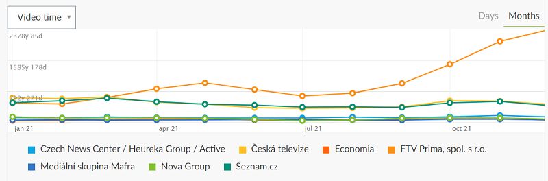 Významné meziroční nárůsty si podle NetMonitoru v počtu zhlédnutých videí loni připsal také Czech News Center (společně s weby Active Radio a Heureka.cz), které rostly zejména díky portálu Blesk.cz. CNC se tak stal v roce 2021 druhým nejsilnějším provozovatelem podle počtu zhlédnutých videí. Třetím nejsilnějším byla mediální skupina Mafra, tažená především serverem iDnes.cz, s mírným odstupem před FTV Prima. Do pětice nejsilnějších podle počtu video zhlédnutí patří ještě skupina Nova.