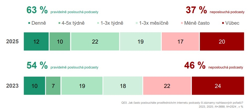 Poslech podcastů má podle výzkumu rostoucí tendenci. Meziročně vzrostl podíl pravidelných posluchačů (alespoň 1× týdně) z 36 % (2023) na 44 % (2025). Největší nárůst byl zaznamenán ve věkových kategoriích 25–44 let, ale více než 40 % posluchačů podcastů je i ve věku nad 45 let. Mladí lidé ve věku 15–24 let tvoří stále nejaktivnější skupinu, přičemž 72 % z nich poslouchá podcasty alespoň jednou měsíčně. Největší bariérou pro častější poslech zůstává nedostatek času.