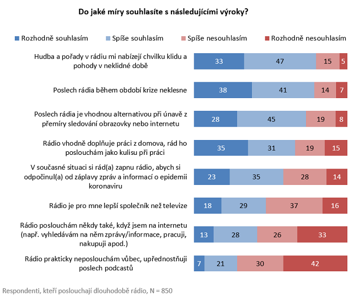 Rádio je obecně media typem, kterému lidé poměrně věří, téměř čtyři pětiny posluchačů jsou přesvědčeny, že změny, které přinesla pandemie koronaviru, v první polovině roku 2020, se rádia nijak nedotknou a poslech rádia během období krize neklesne. Mezi těmito osobami najdeme častěji ženy a obyvatele větších měst.