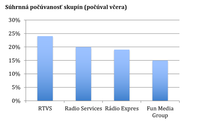 Z hľadiska rozhlasových domov dosahuje najvyššie čísla RTVS, ktorá mala so šiestimi meranými stanicami Rádio Slovensko, Rádio Regina, Rádio_FM, Rádio Devín, Rádio Patria a Rádio Patria v minulom roku súhrnnú počúvanosť približne 24% (parameter „počúval včera″). Radio Services, predávajúce stanice Jemné, Europa 2, Vlna a Anténa Rock, získalo s týmito stanicami dokopy asi 20%. Rádio Expres samotné prekračovalo 19% a skupina Fun Media Group mala približne 15%. Do jej portfólia patrí okrem materského Fun rádia kresťanský Lumen a niekoľko regionálnych alebo lokálnych hráčov.